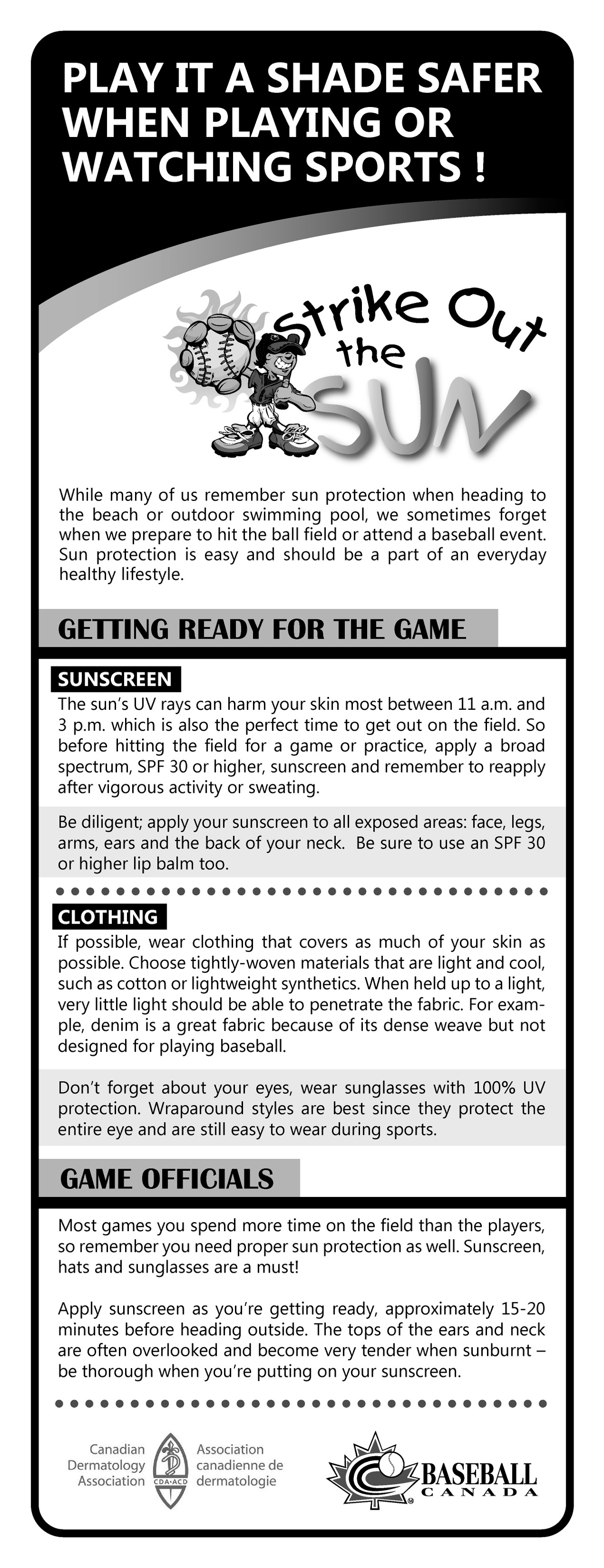 Baseball Canada, in consultation with the Canadian Dermatology Association, are pleased to provide the following “sun safety” tips and information that will help keep you safe at the ballpark this season!
